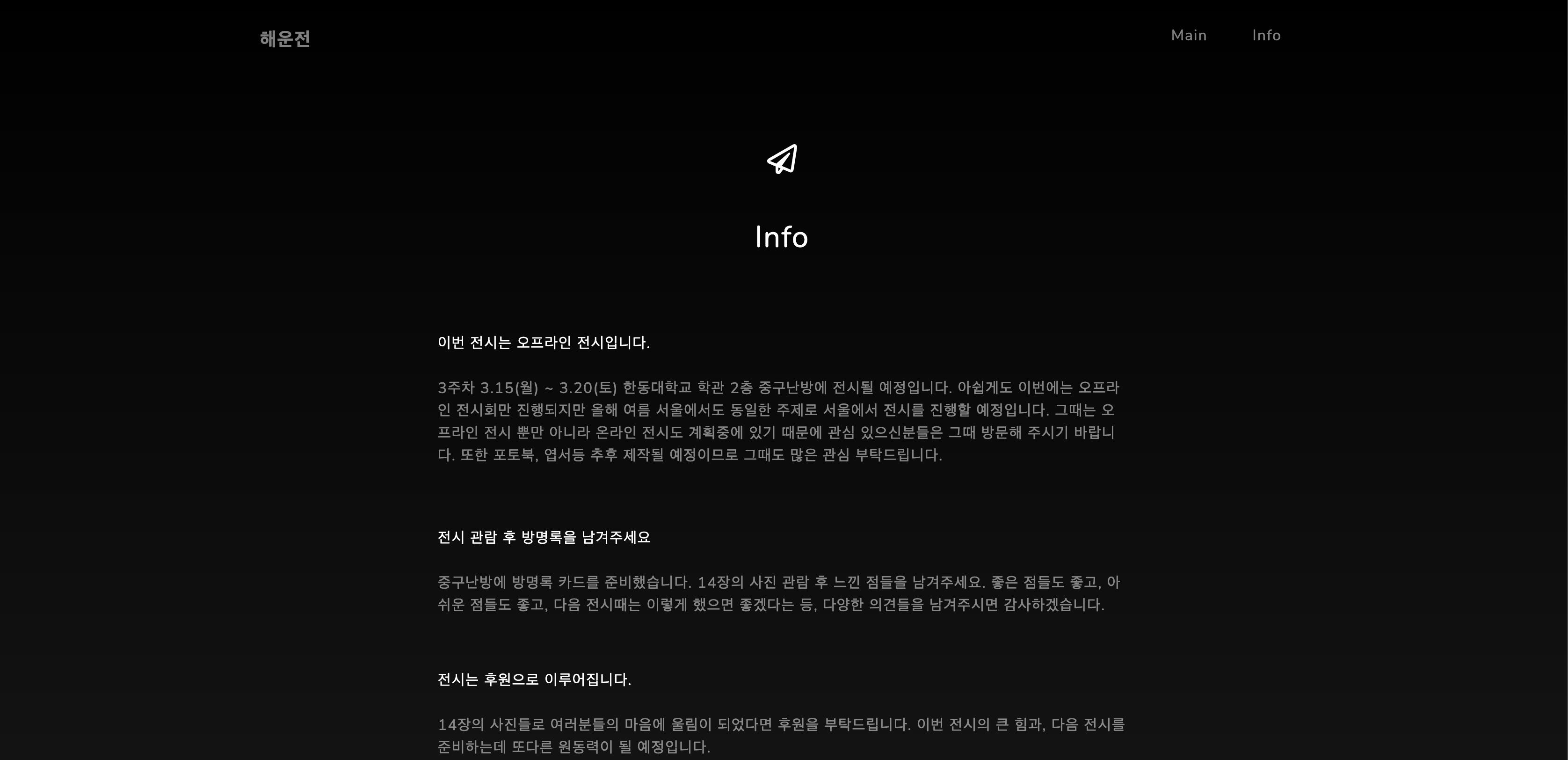 많았지만, 많은 분들이 옆에서 함께 도와주셔서 전시를 할 수 있었습니다.<br><br> 모델을 해준 Winter, 웹사이트 제작에 도움을 준 Hyewon, 사진 배치 및 큐레이팅을 해준 새내기